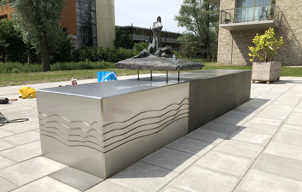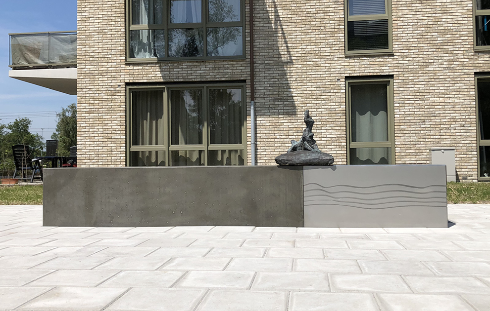 De betonnen bank is gegoten bij Struyk Verwo Infra in Westervoort en het rvs deel is vakkundig gelast door Tummers Plaatbewerking in Hoogerheide. Van Wijnen heeft het appartementencomplex in Purmerend gebouwd en heeft me geholpen met de plaatsing van de bank